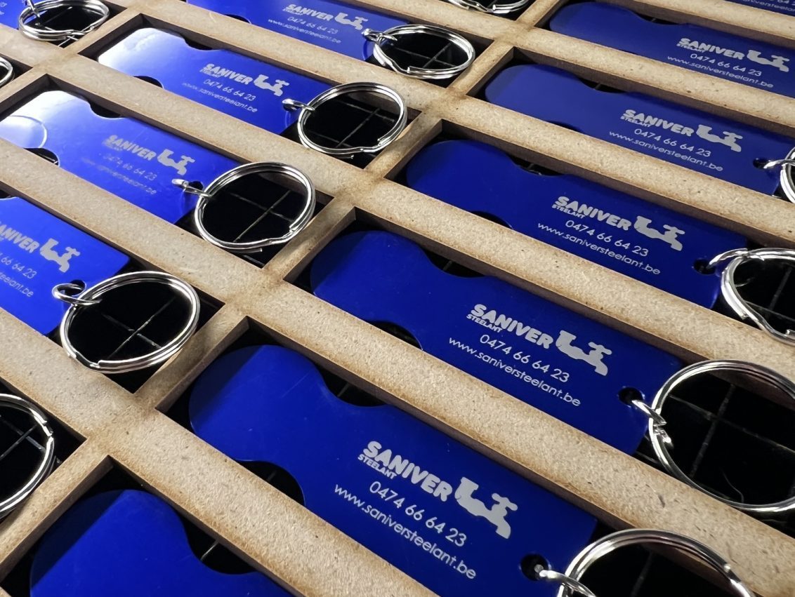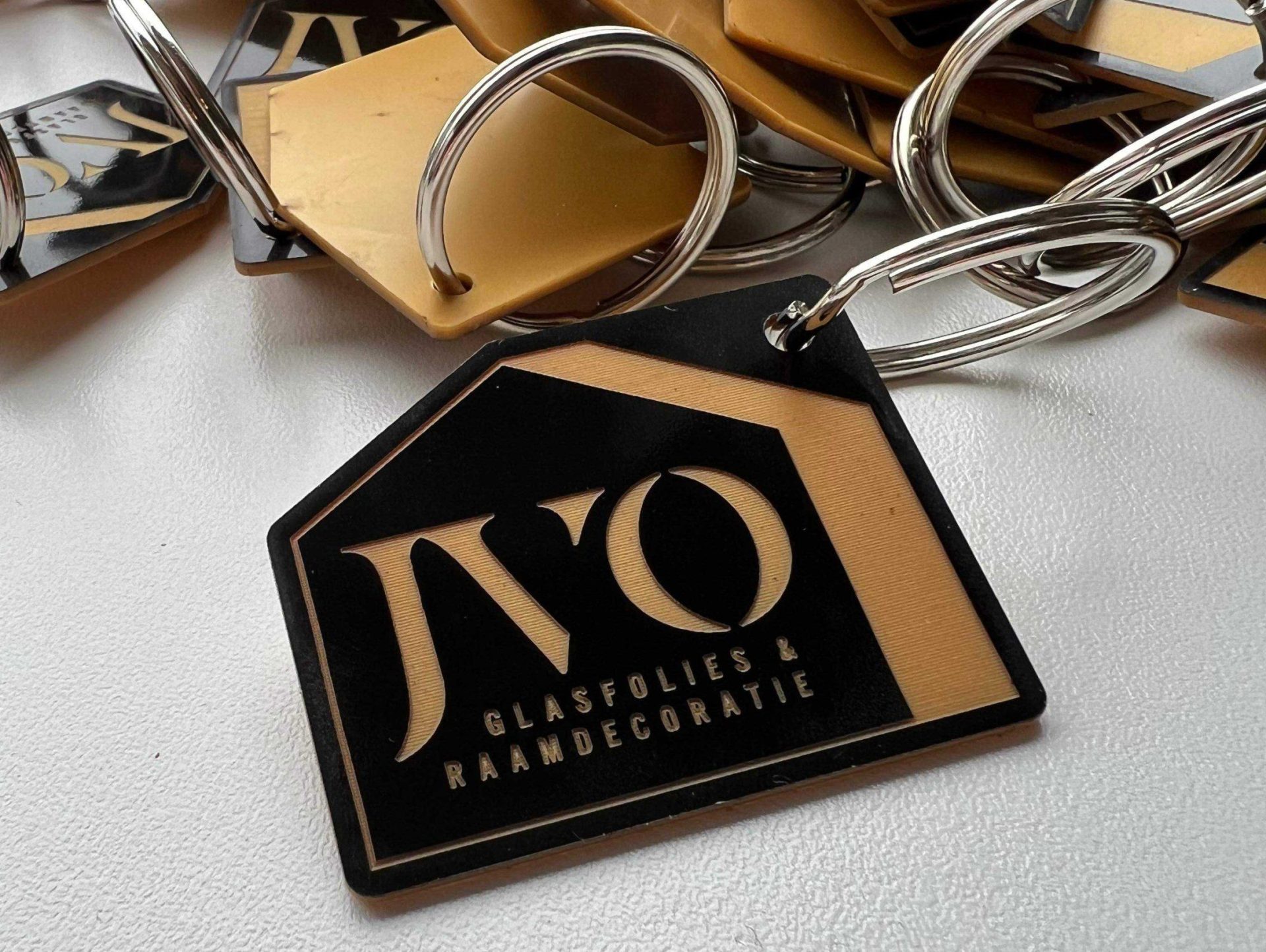 Voor JVO Glasfolies maken we duurzame sleutelhangers in gekleurd kunststoflaminaat: strak, professioneel en volledig op maat. De ideale manier om hun merk dagelijks zichtbaar te maken.