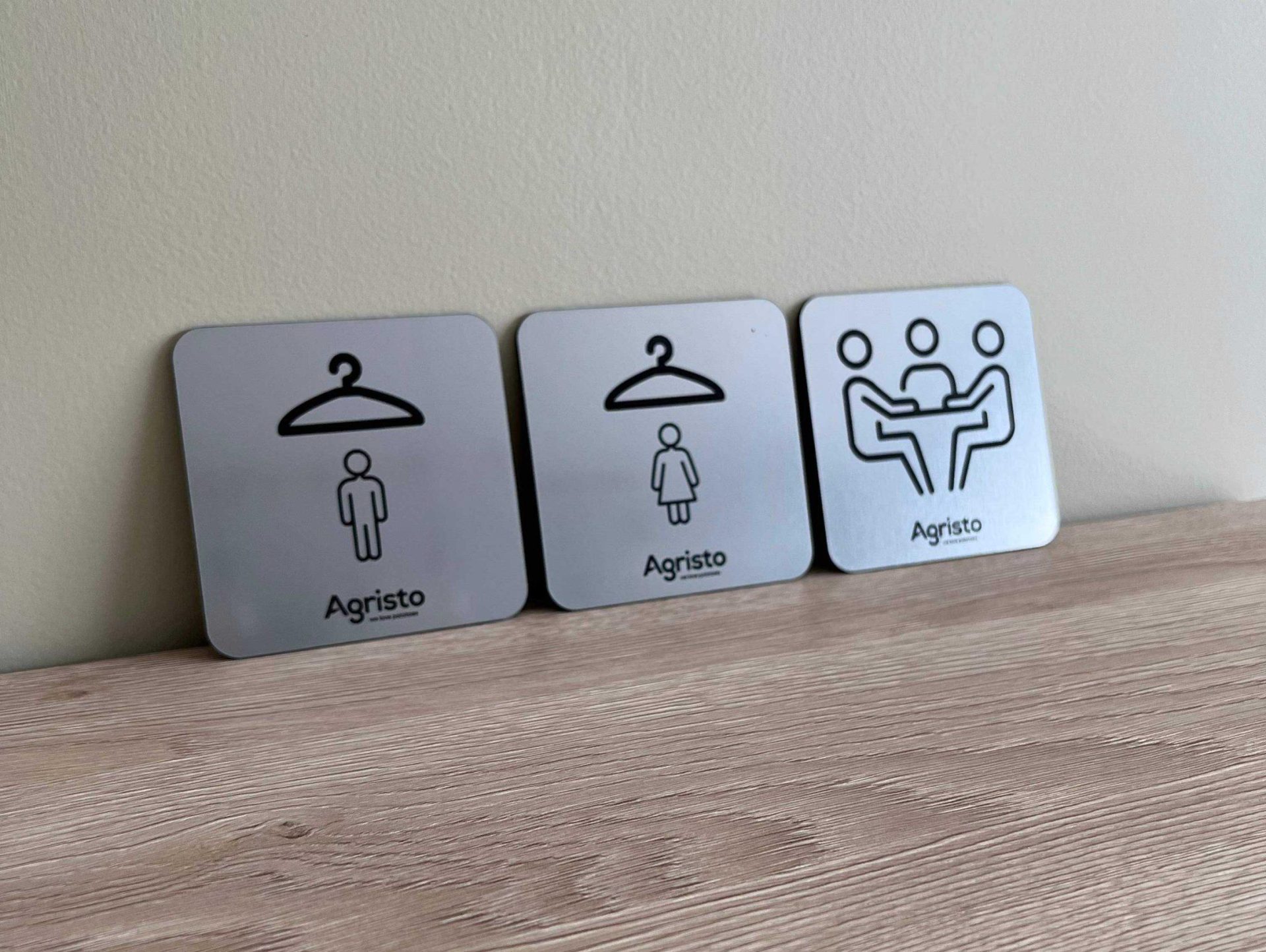 Voor Agristo maken we strakke deurbordjes in inox-look kunststoflaminaat: duidelijk, duurzaam en professioneel gelaserd voor elke ruimte binnen hun faciliteiten.