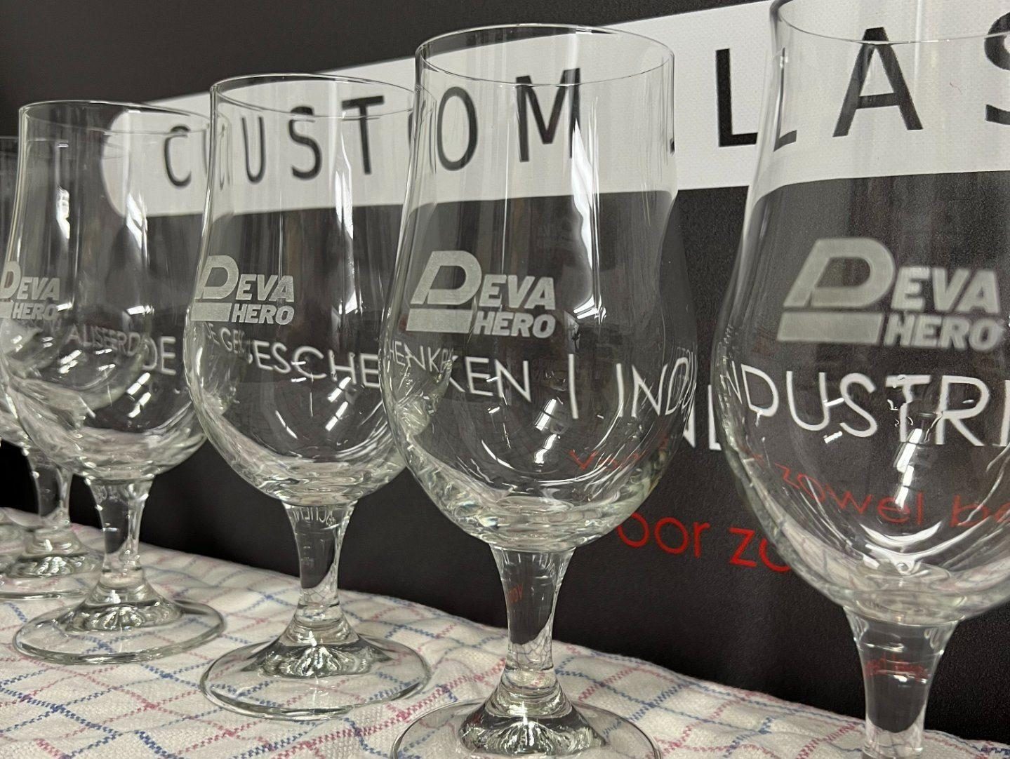 Voor Devagro maken we gegraveerde glazen met een strakke, duurzame afwerking. Een stijlvolle manier om hun merk te presenteren bij events, klantenbezoeken of interne momenten.