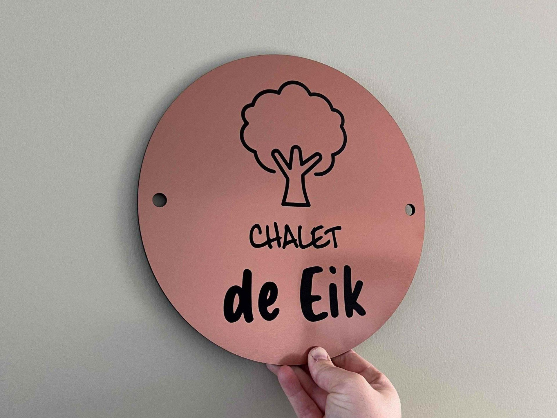 Een stijlvol chalet-uithangbord in brons-look kunststoflaminaat: duurzaam, elegant en volledig personaliseerbaar met lasergravure. De perfecte finishing touch voor elke chalet of vakantiewoning.