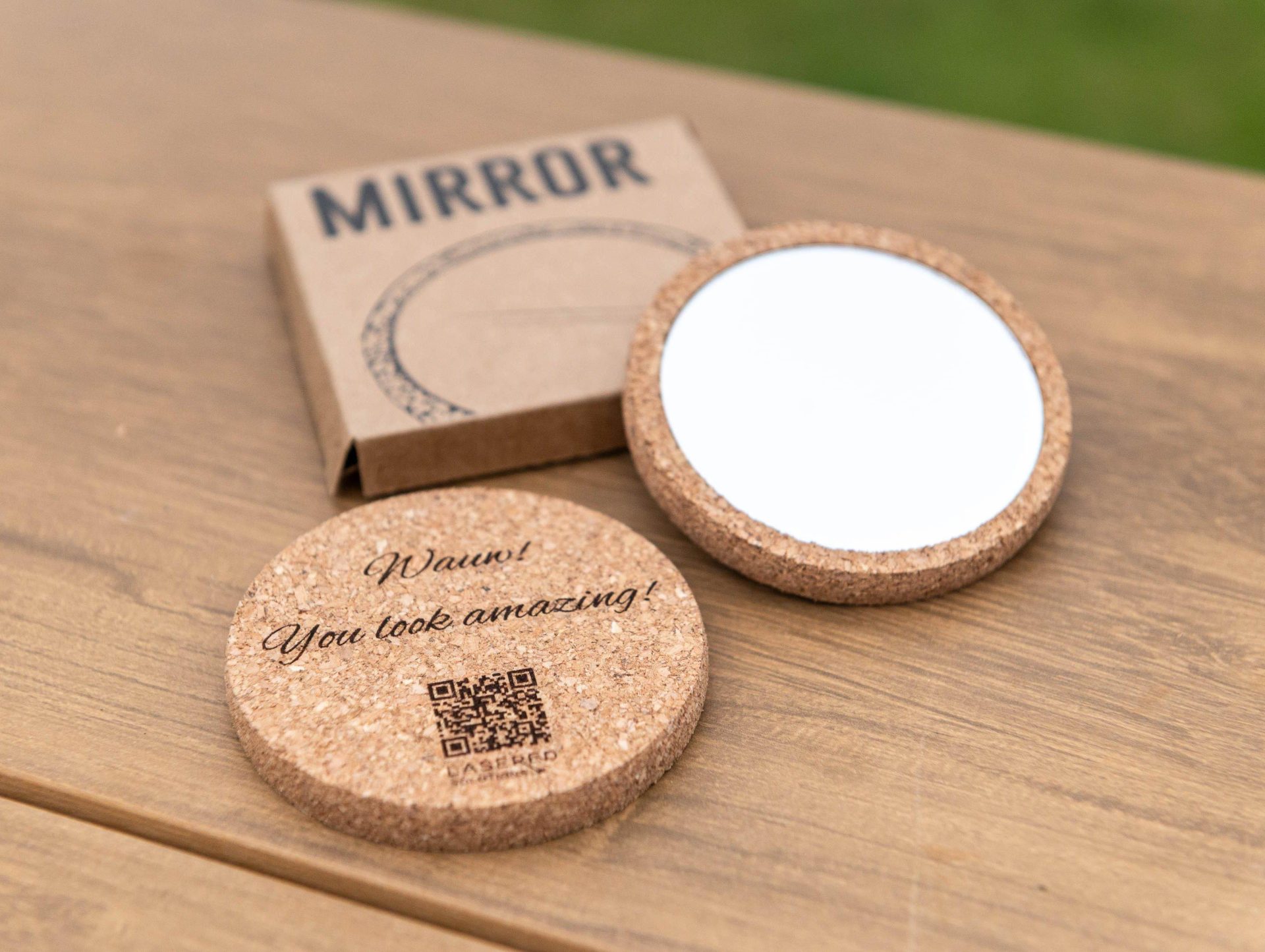 Kurken zakspiegeltjes met fijne gravure: licht, natuurlijk en perfect als stijlvol geschenk, merchandising of bedankje.
