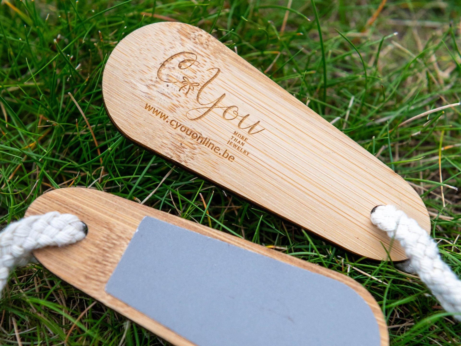 Voor C you maken we bamboe nagelvijltjes met een fijne, permanente gravure: stijlvol, duurzaam en ideaal als elegant geschenk of merchandisingitem.