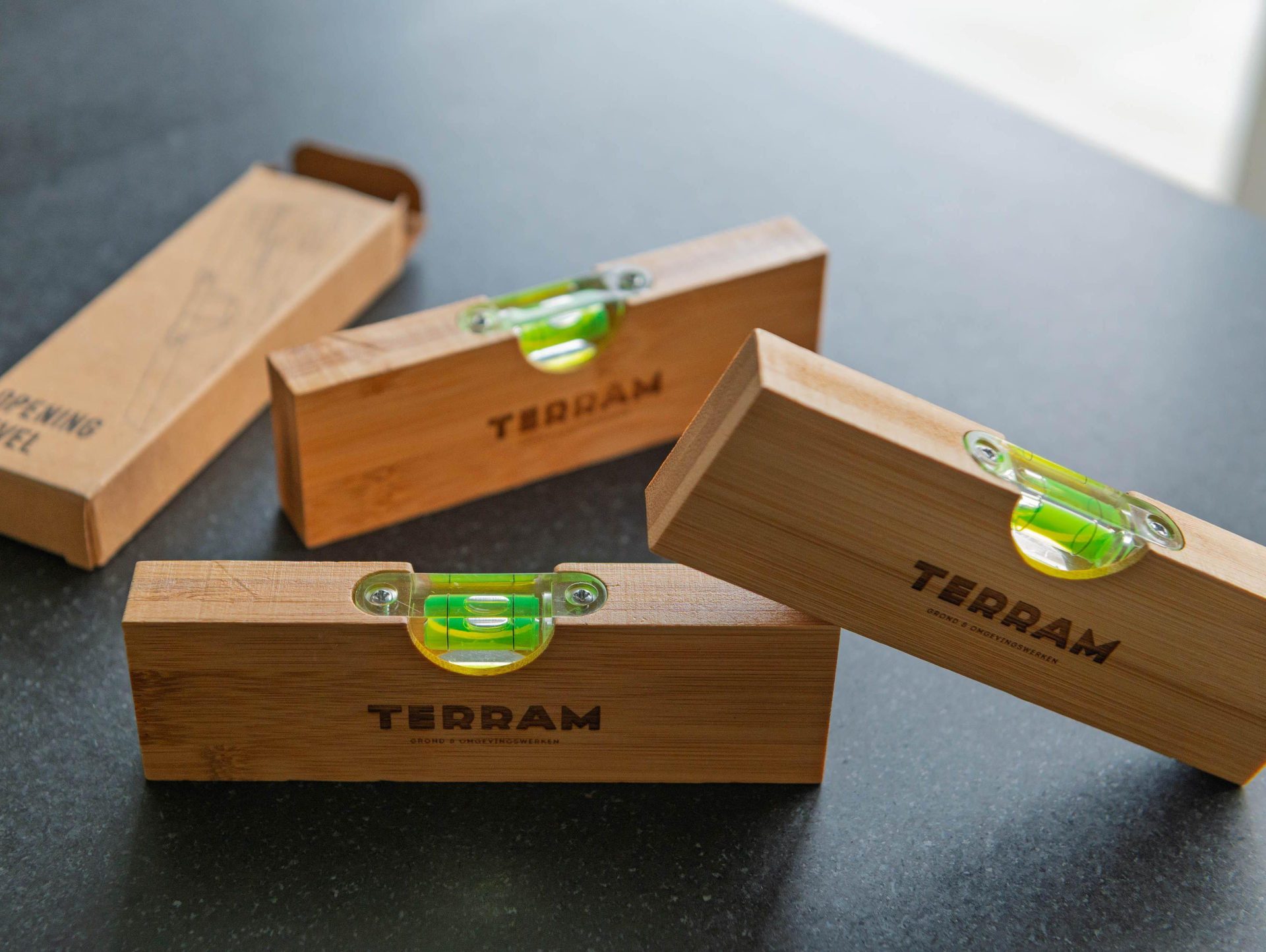 Gegraveerde bamboe waterpassen met geïntegreerde flesopener: stijlvol, duurzaam en perfect als uniek relatiegeschenk voor bouw- en technische bedrijven.