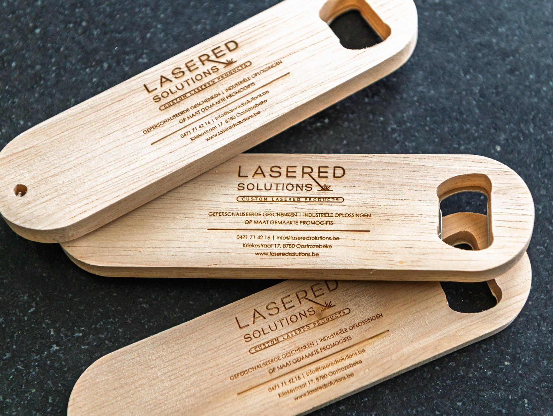 Flesopeners in rubberhout met lasergravure: stijlvol, stevig en perfect als persoonlijk relatiegeschenk of promotiemateriaal.