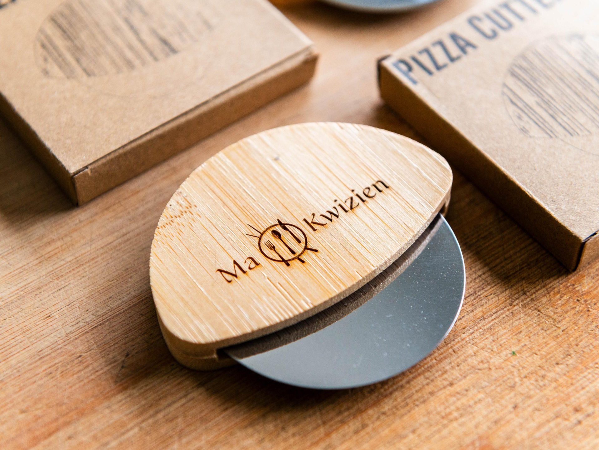 Gegraveerde bamboe pizzasnijder: stijlvol, duurzaam en ideaal als origineel relatiegeschenk of promotiemateriaal voor keukenzaken en foodconcepten.
