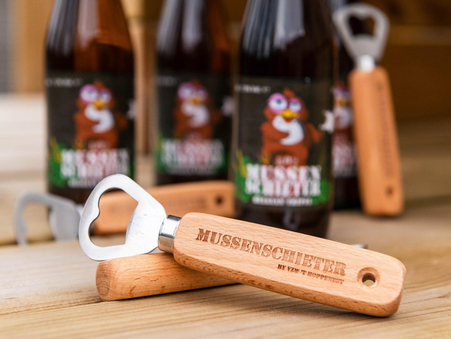 Gegraveerde houten flesopeners voor vzw 't Hoppenest