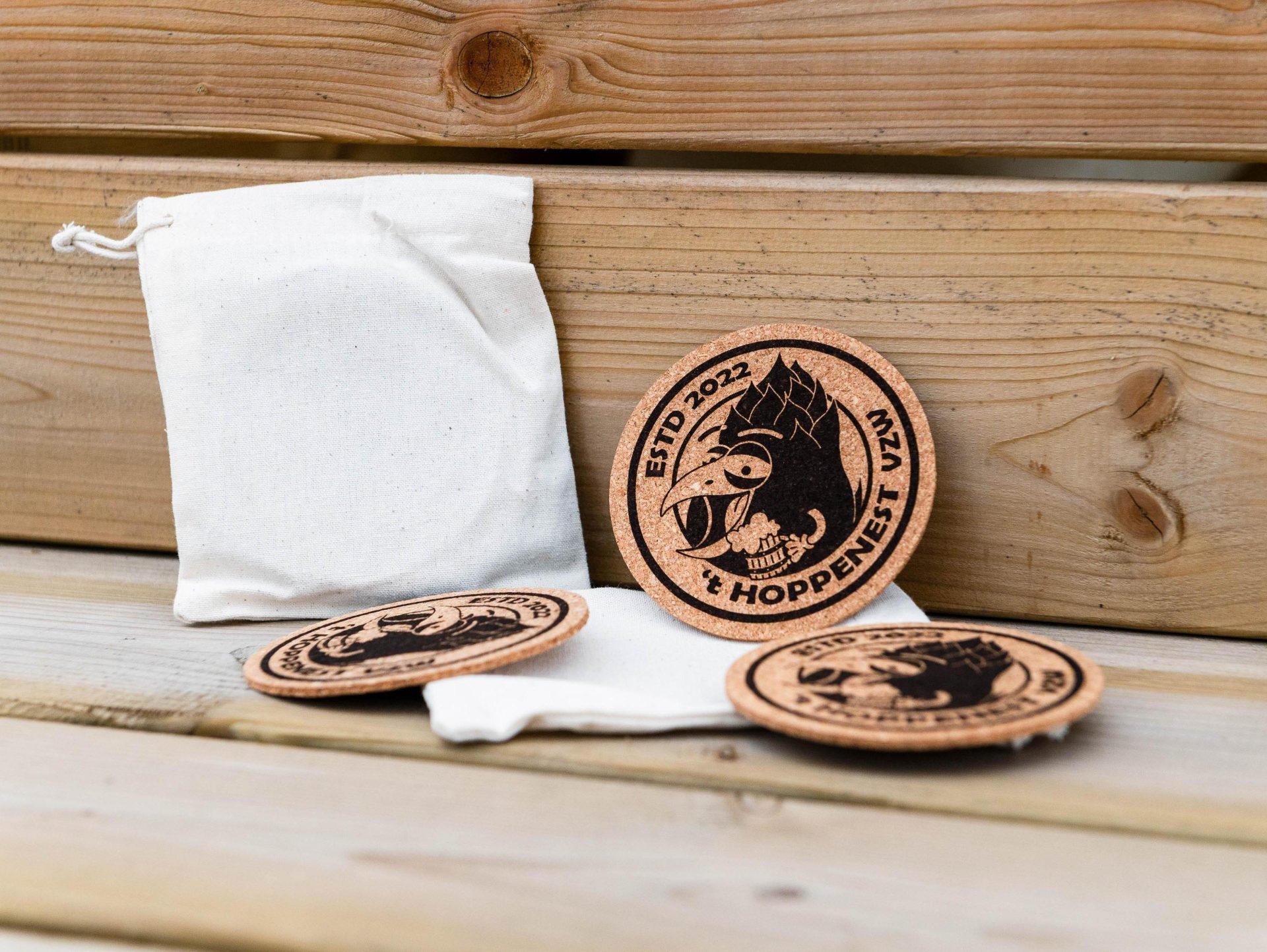 Kurken onderzetters in een katoenen zakje: duurzaam, stijlvol en perfect als gepersonaliseerd geschenk of promotiemateriaal.