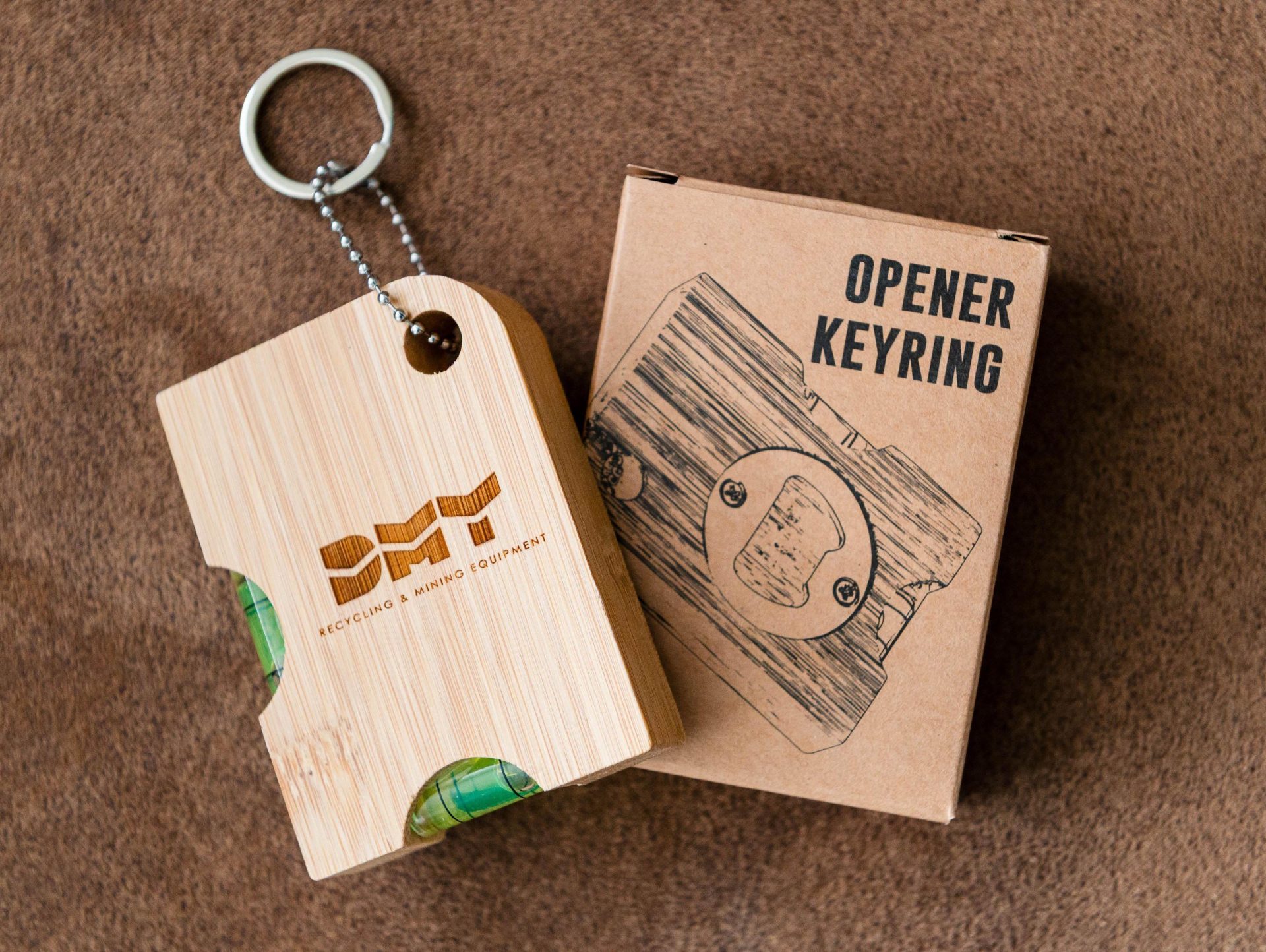 Waterpas-sleutelhanger in bamboe met geïntegreerde flesopener: compact, stijlvol en ideaal als functioneel relatiegeschenk of promotiemateriaal.