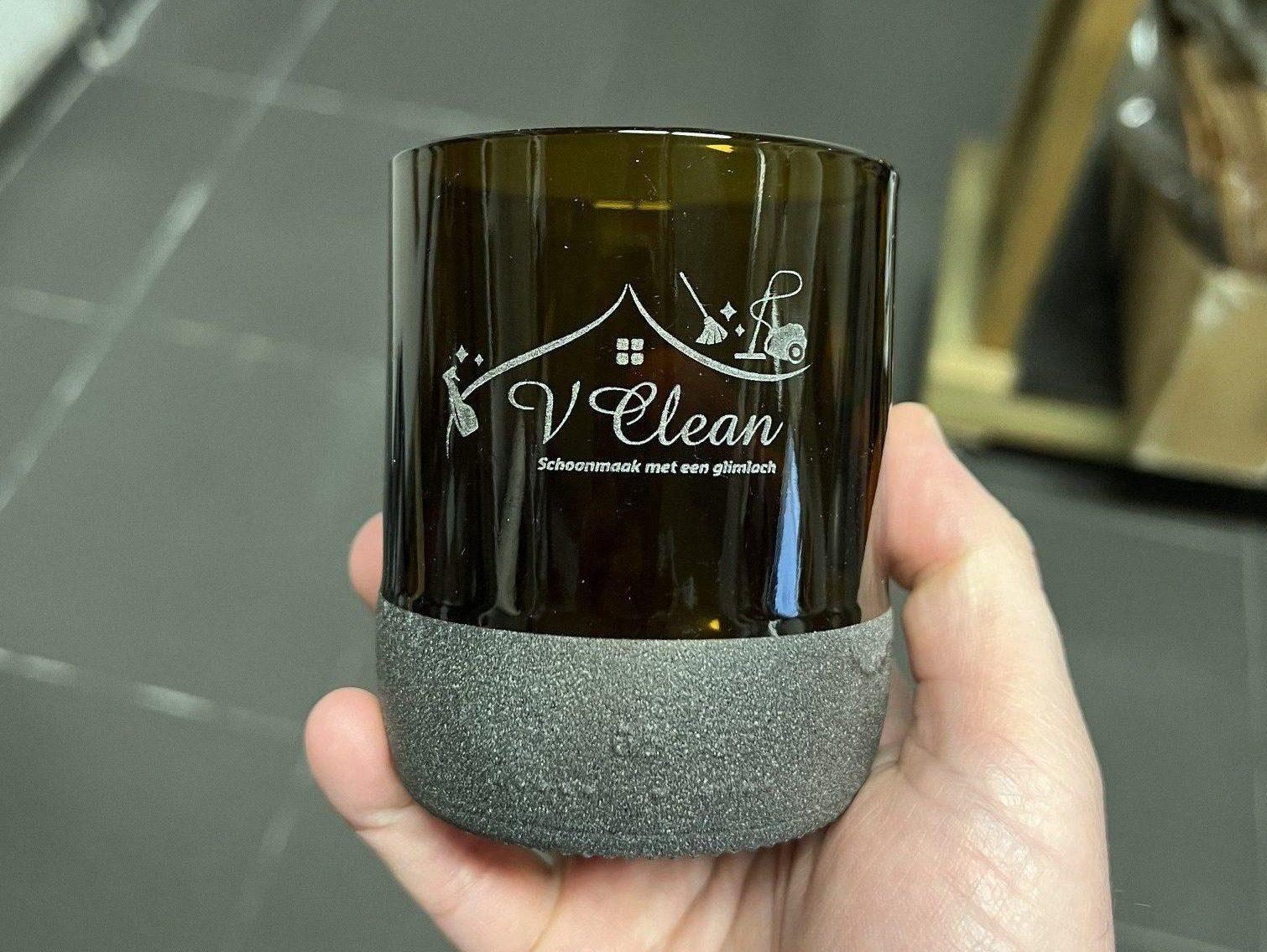 Voor V Clean creëren we stijlvolle, gegraveerde glazen die hun professionele en verzorgde uitstraling perfect weerspiegelen — tot in het kleinste detail.