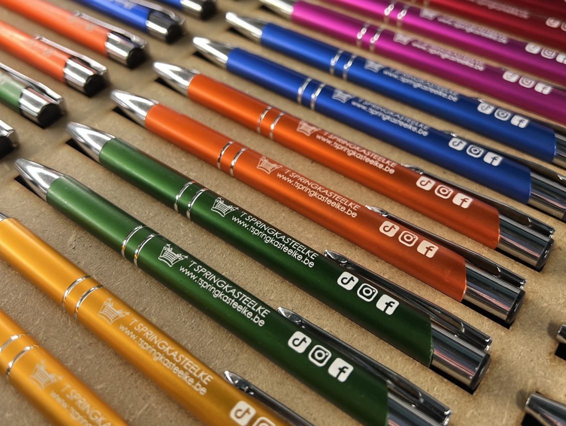 Voor ’t Springkasteelke maken we speelse, gepersonaliseerde balpennen die hun vrolijke en toegankelijke uitstraling perfect versterken.