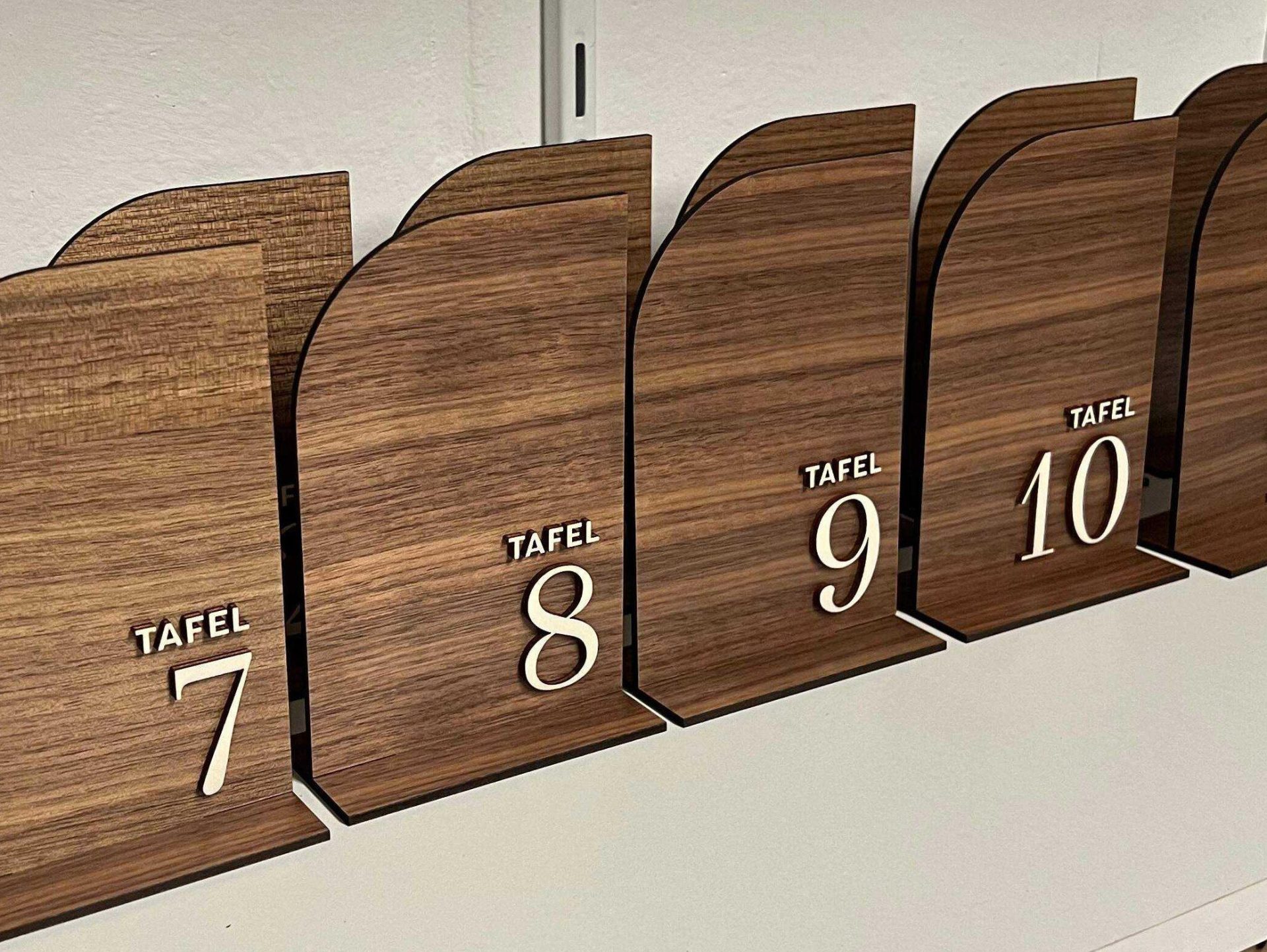 Stijlvolle tafelnummering: duurzaam, elegant en volledig personaliseerbaar voor horeca én trouwfeesten.