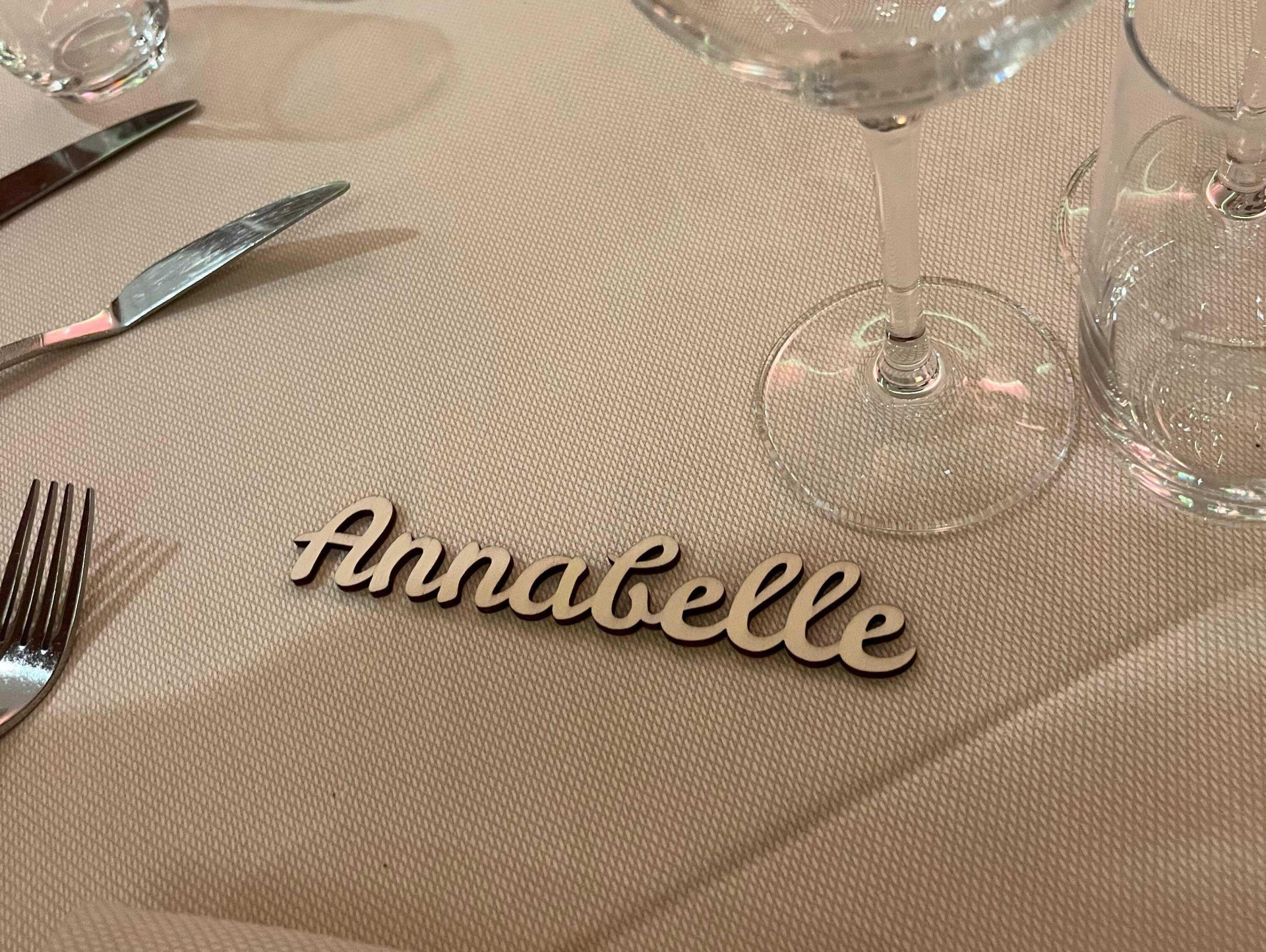 Houten tafelnamen, nauwkeurig lasersneden: elegant, natuurlijk en perfect voor huwelijken en grote feesten. Een stijlvolle eyecatcher op elke tafel.