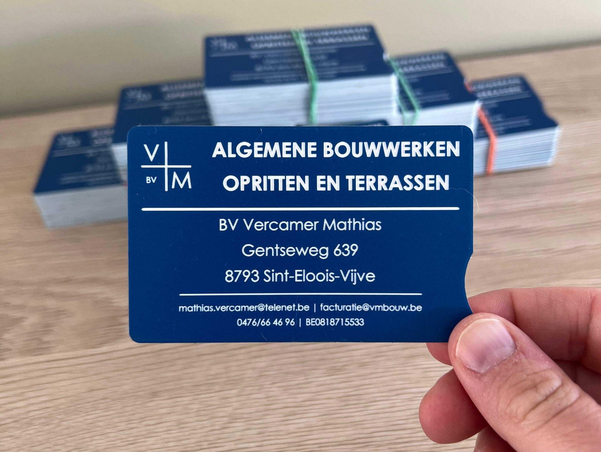Voor Algemene Bouwwerken Mathias Vercamer maken we deluxe visitekaartjes in kunststoflaminaat: stevig, stijlvol en met een premium uitstraling die perfect past bij hun vakmanschap.