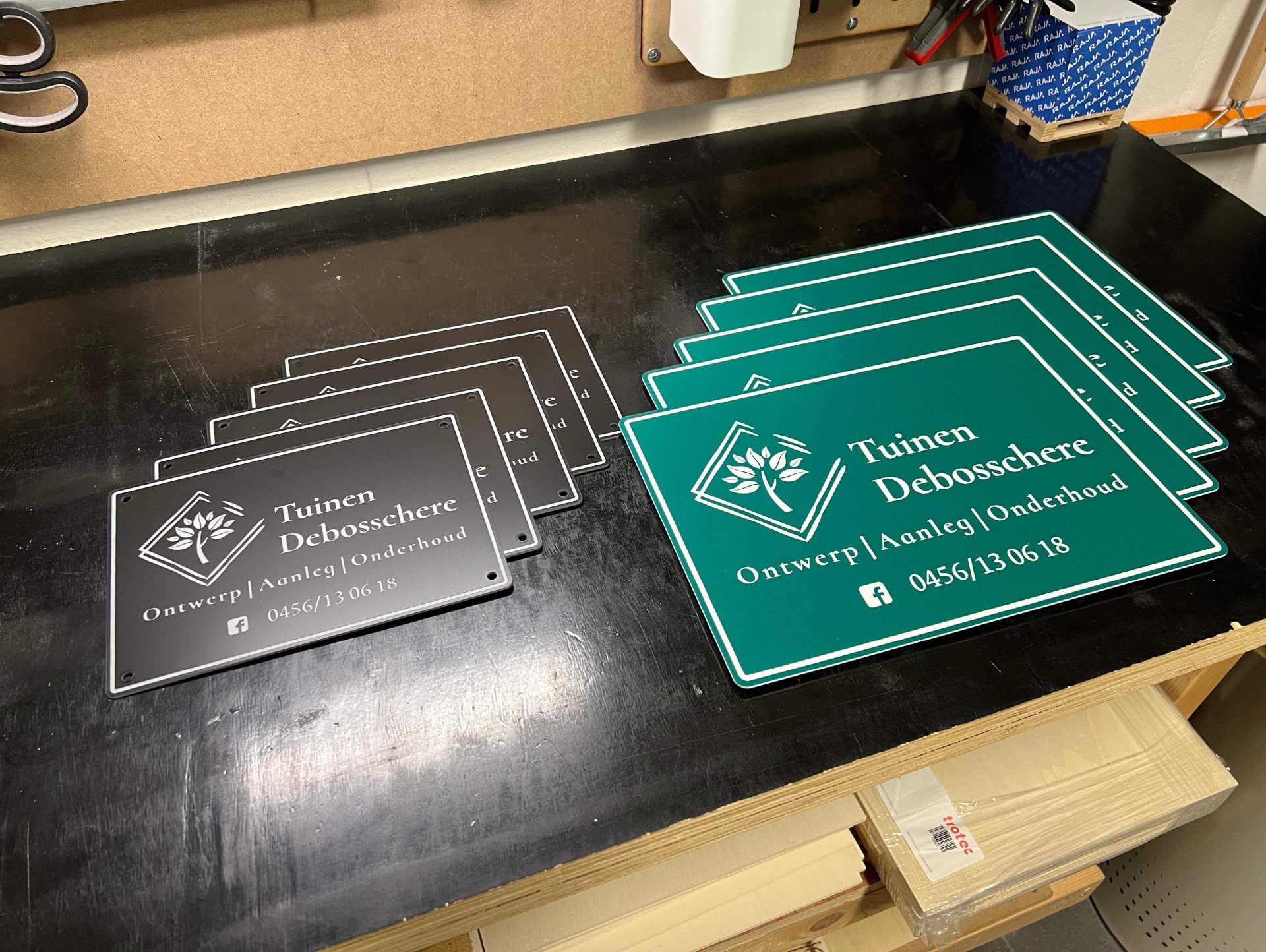 Voor Tuinen Debosschere maken we duurzame bordjes voor tuinomheiningen: stijlvol, weerbestendig en volledig op maat ontworpen voor een professionele en verzorgde uitstraling.