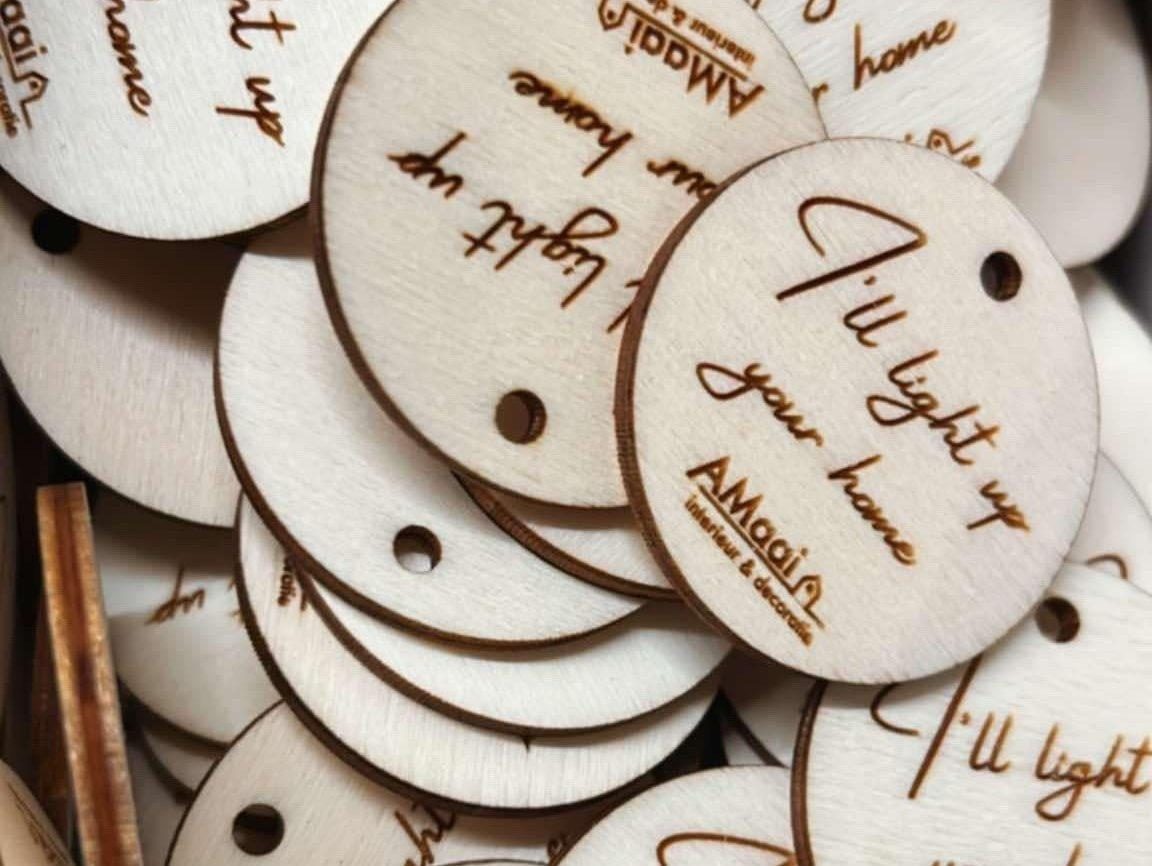Voor AMaai-interieur verzorgen we al geruime tijd gepersonaliseerde, houten naamlabels die perfect aansluiten bij hun duurzame, eigentijdse interieurprojecten. Ontdek hoe onze samenwerking ook voor jouw bedrijf waarde kan toevoegen.