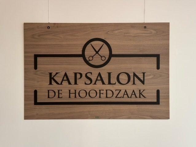 Voor kapsalon De Hoofdzaak maken we een stijlvol interieur-uithangbord met hun logo: elegant, modern en een echte eyecatcher binnen de zaak.